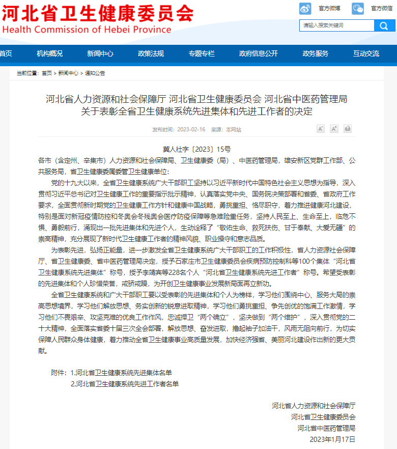? ? ? ?為表彰先進,弘揚正能量,進一步激發(fā)全省衛(wèi)生健康系統(tǒng)廣大干部職工的工作積極性,2023年2月16日,河北省衛(wèi)生健康委員會官方網(wǎng)站正式發(fā)布了由河北省人力資源社會保障廳、河北省衛(wèi)生健康委員會、河北省中醫(yī)藥管理局聯(lián)合下發(fā)的《關(guān)于表彰全省衛(wèi)生健康系統(tǒng)先進集體和先進工作者的決定》。其中,我院榮獲“河北省衛(wèi)生健康系統(tǒng)先進集體”稱號。