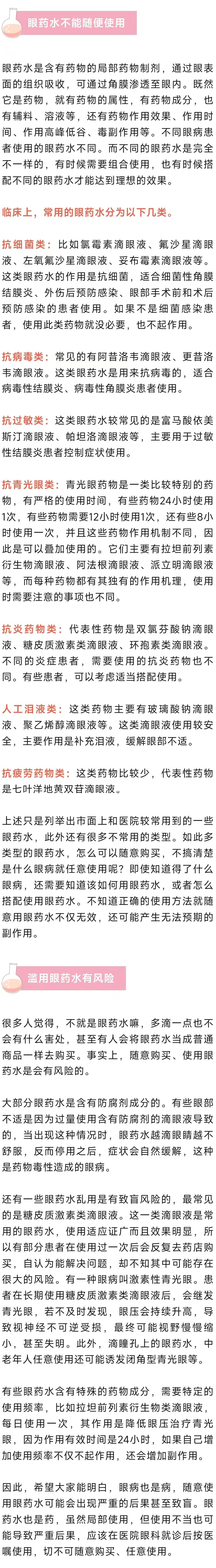 “醫(yī)生,你不用給我開藥了,我自己有眼藥水?!薄搬t(yī)生,我自己一直在點那種有保健功能的眼藥水,為什么眼睛還是會不舒服?”“醫(yī)生,我家里人眼睛痛自己來不了,你幫我給他開點眼藥水行不行?”在出診的時候,我經(jīng)常聽到患者說這幾句話。很多人認為,眼藥水可以治療任何眼病,可以隨便買來使用,反正不會有害。殊不知,這種想法是錯誤的。