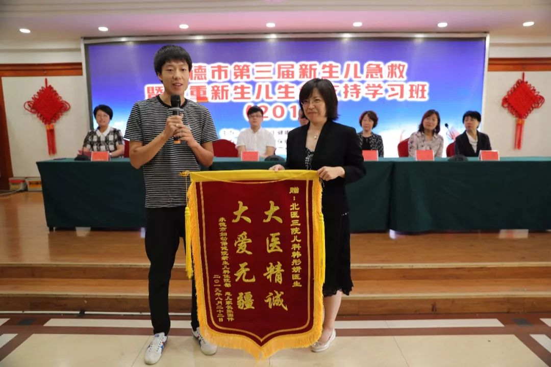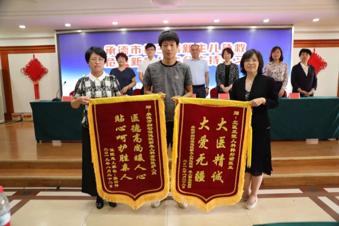 金秋八月、丹桂飄香,2019年8月24日早8點,由我院承辦的“2019年承德市第三屆新生兒急救暨危重新生兒生命支持學(xué)習(xí)班”正在云山飯店二樓舉行,就在培訓(xùn)授課即將開始的時候,一位患兒家長急匆匆的趕到會場,要把兩面分別寫有“大醫(yī)精誠、大愛無疆”及“醫(yī)德高尚暖人心、貼心呵護(hù)勝親人”的錦旗送給應(yīng)邀前來授課的北醫(yī)三院兒科副主任韓彤妍教授及承德市婦幼保健院新生兒科全體醫(yī)護(hù)人員,這個舉動讓參加開幕式的各位領(lǐng)導(dǎo)、專家及全體參會學(xué)員感到非常驚訝,王鳳東副院長立即就認(rèn)出了患兒家長,這不就是一個月前在新生兒科救治的危重患兒的家長嗎?兩面錦旗牽出了一段京冀醫(yī)療合作惠及承德民生的真實感人故事。