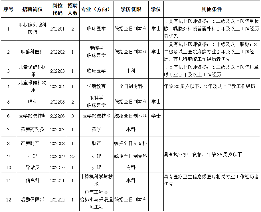? ? ? ?為滿足工作需要,經(jīng)請(qǐng)示衛(wèi)健委同意,現(xiàn)面向社會(huì)公開招聘醫(yī)療、醫(yī)技、護(hù)理、助產(chǎn)、幼教、管理等崗位編外工作人員37名。